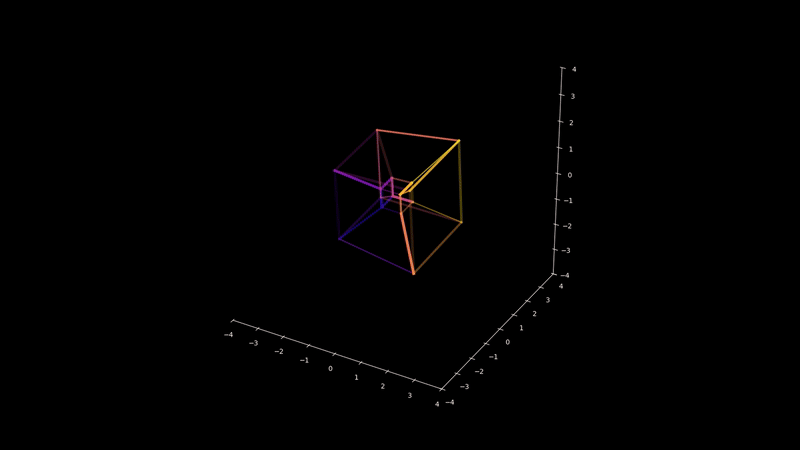 A rotating 4D cube rendered in Python using NumPy and Matplotlib.