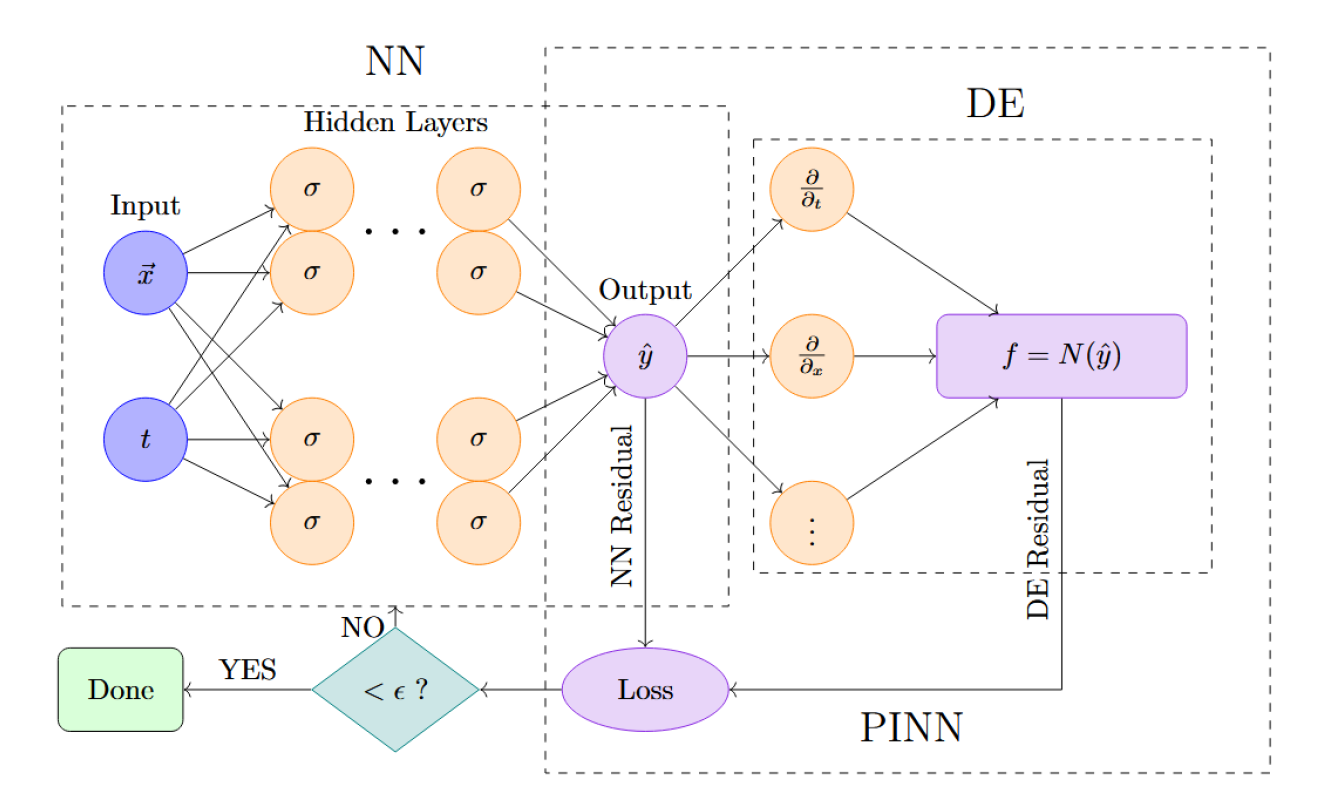 Think of a Physics-Informed Neural Network as two modules stitched together. The first is a standard feed-forward neural network: it takes in space-time coordinates, processes them through multiple hidden layers, and outputs a prediction for the flow variables. Right beside it is a physics layer. Using automatic differentiation, we can compute all the partial derivatives required by the governing equations.