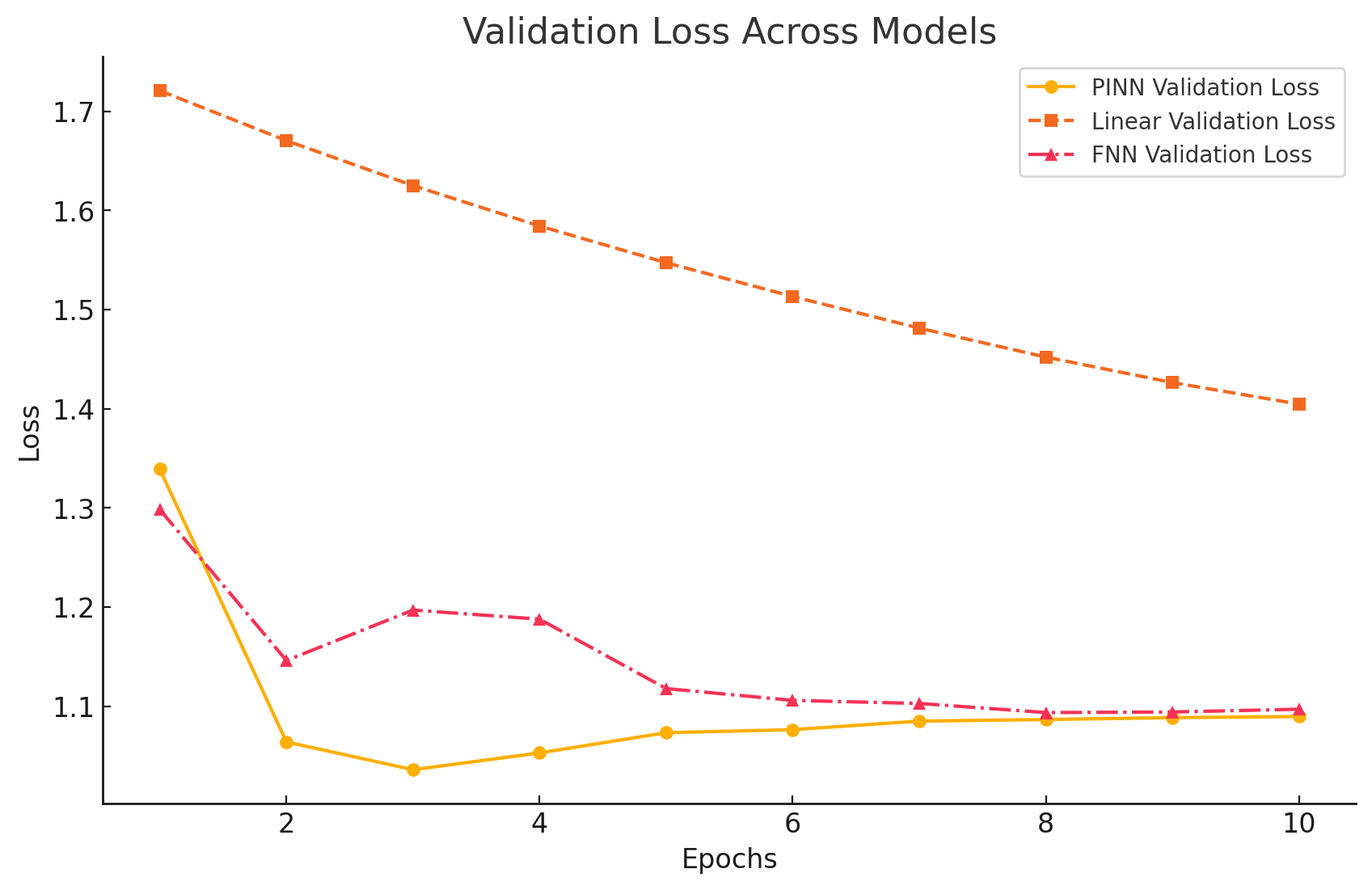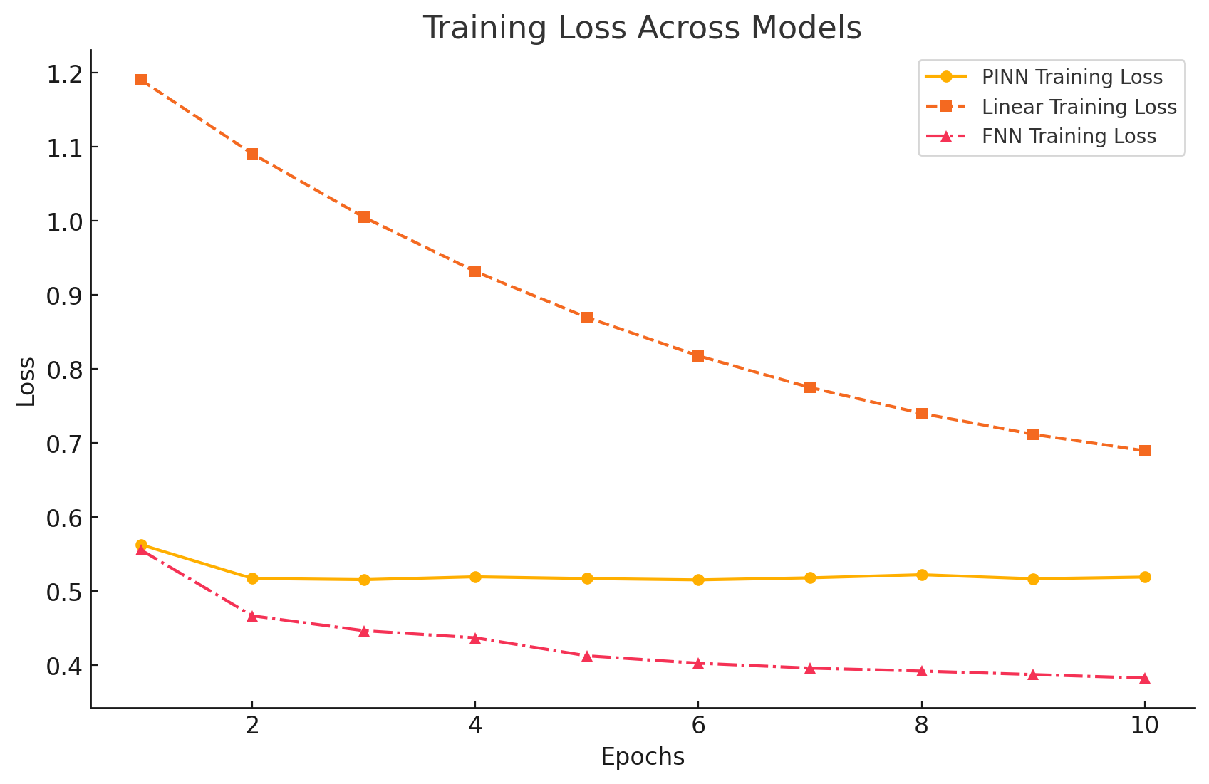 Across ten training epochs on a dataset of approximately twenty million points (10M points for training, 10M for validation, batch size 4096), the three models drift in different directions. The linear fit slashes its training loss the quickest, the plain FNN follows, and the PINN, which carries that extra physics penalty, levels off a little higher.